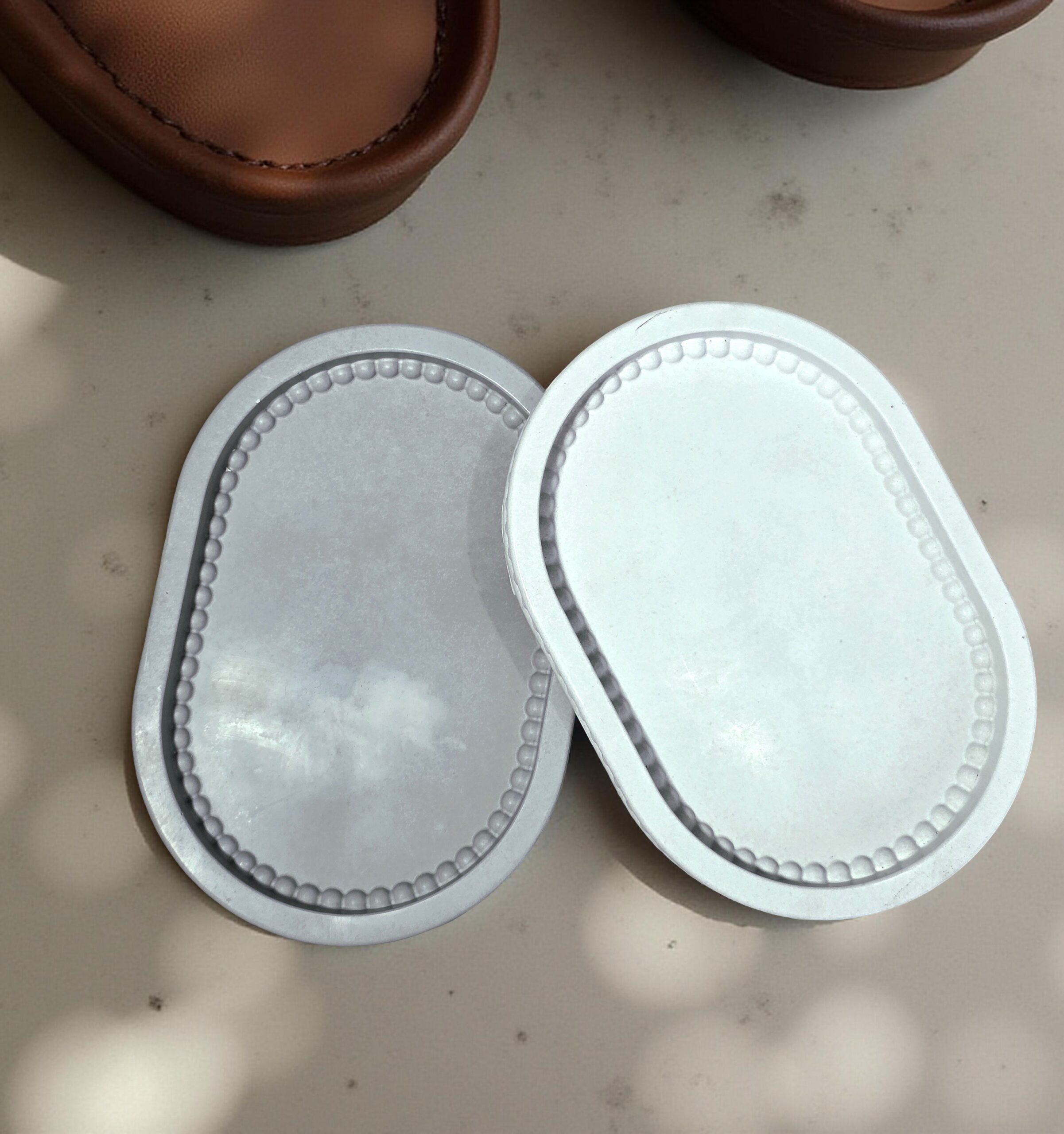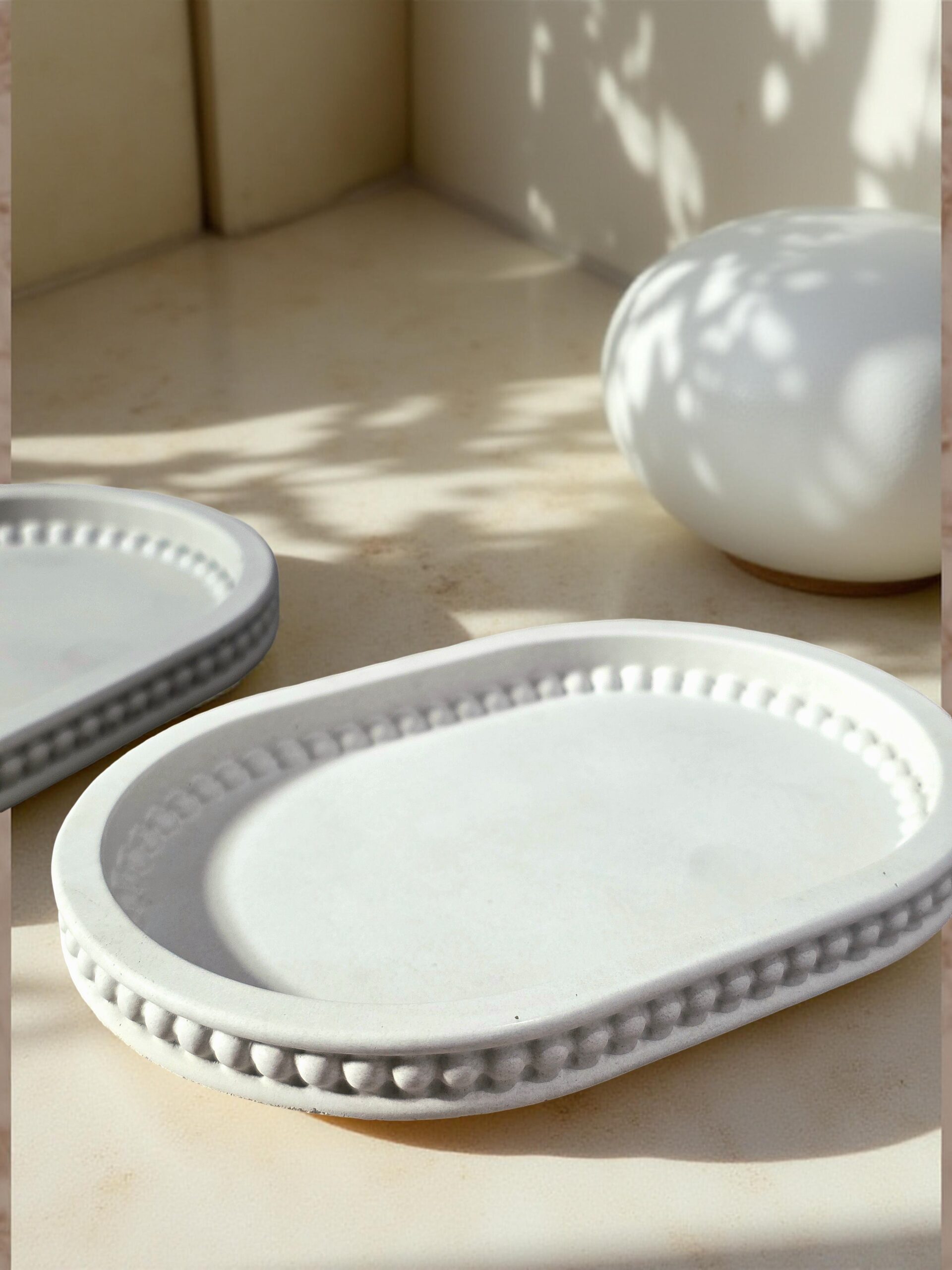 Add a subtle decorative touch to your space with this handmade oval beaded concrete tray. Featuring a softly rounded shape and an elegant beaded edge, this piece blends modern minimalism with timeless detail.
